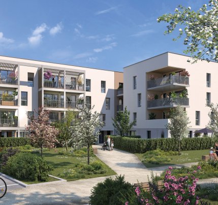 L’environnement verdoyant est au cœur du projet : arbres de haute tige conservés, revégétalisation des abords, parkings engazonnés et ombragés, local à vélo en sous-sol…